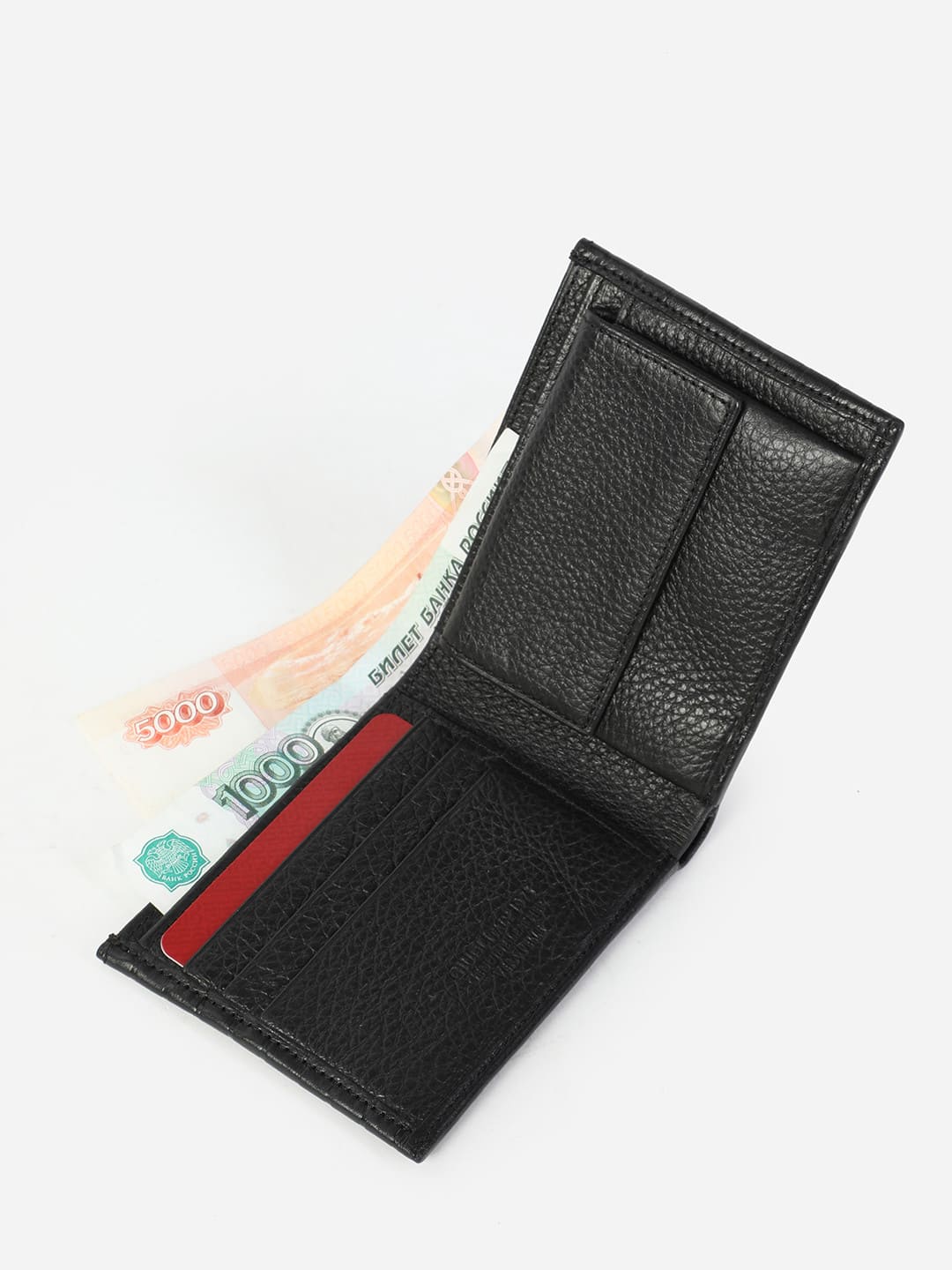 Стильный компактный кошелек выполнен из натуральной кожи с тиснением. Закрывается без фиксации, внутри кроме отделений для купюр, предусмотрен металлический зажим. Есть несколько ячеек под пластиковые карточки и молниевый карман для монет. Аксессуар упакован в коробочку, станет отличным вариантом для подарка мужчине.